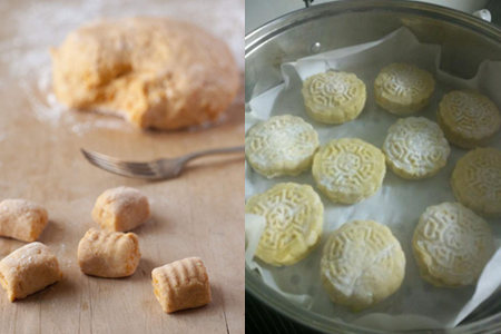 这个时候就可以把粉团分成软干份,再压成饼。在锅里隔水蒸熟就完成了,如果喜欢吃脆脆的,也可以把番薯饼煎熟。