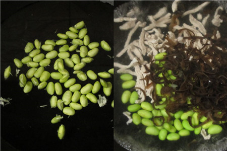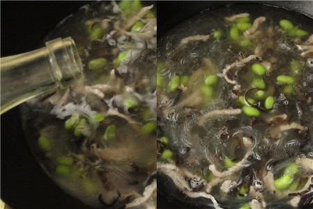 把毛豆倒进煮好的沸水中过一下,目的是去掉外面的一层薄膜,使得口感更好。然后将猪肉焯一下水,取出泡好的木耳,用刀切成细丝和猪肉一起倒进锅中,大火煮开,期间加一点食盐调味。