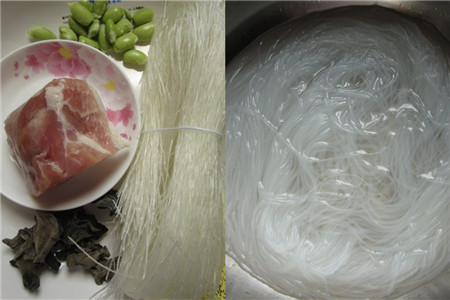 做猪肉粉丝汤当然不能少了猪肉和粉丝,粉丝尽量选择细的,更好入味,把猪肉切成细条状或者薄片状都可以,看个人喜好。用温热水将粉丝淹没泡软,不然有的粉丝会一直都煮不软影响口感,然后也将木耳泡发。