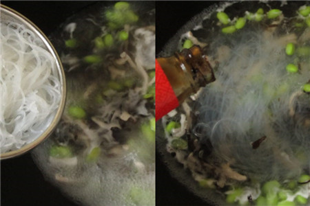 大概煮三分钟就可以倒进粉丝了,因为煮太久的话肉质会变老。粉丝本就很容易煮熟,所以加入粉丝后就可以根据自己的口味放耗油了,耗油有提鲜增味的作用,使汤汁更为鲜美。