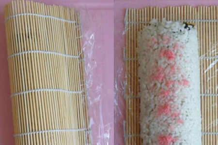 第四, 将寿司帘卷起,用手压紧,然后把帘子打开,在寿司上撒上适量的樱花粉。