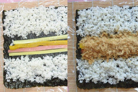 第三, 将米饭、大根、蛋皮、黄瓜和肉松如图上摆放。
