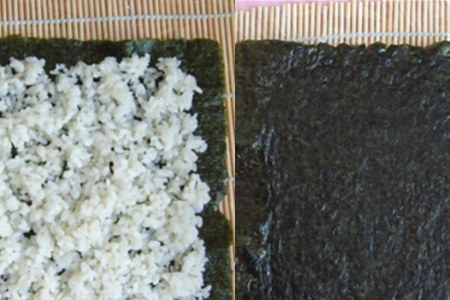 第二, 寿司帘上放一张海苔,在上边铺上珍珠米饭,边缘处留空隙。然后把米饭连着海苔翻面。