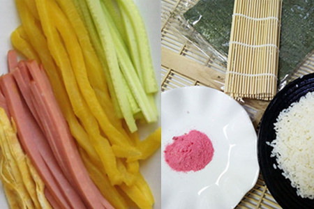 第一, 准备好海苔、珍珠米饭、寿司醋、寿司帘、樱花粉、蛋皮、黄瓜条、大根条、肉松、沙拉酱等材料。