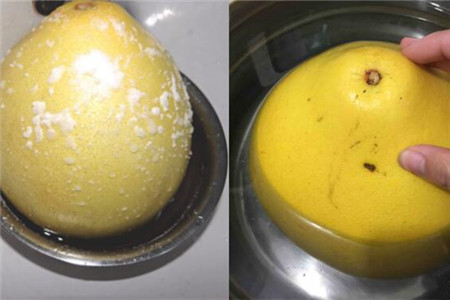 第一步:在超市里面选购色泽良好,果肉饱满的柚子。把柚子用食用盐仔细搓洗,要把每个细节都洗到,这是为了保证做出来的蜂蜜柚子茶的干净卫生。商家为了让柚子看起来光鲜亮丽,就在柚子外面打了一层蜡,然而这种蜡食用后对身体不好,为了去除这层蜡可以用六十度左右的温水浸泡整个柚子,需要浸泡十多分钟,等水凉了就可以拿出来,放到一边沥干。