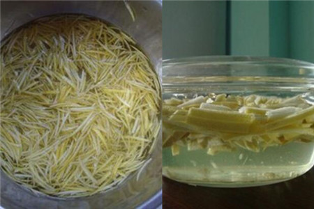 第四步:把刚才切好的柚子丝,用盐水浸泡一个小时以上,捞出来用手反复的搓洗,再用漏盆倒出来用水龙头的清水冲洗,直到把盐水冲干净为止,这个盐水浸泡和搓洗的步骤可以一直反复的操作,这个步骤可以让柚子皮的涩味逐渐减少,以后泡出来才会更加好喝。把清洗干净后的柚子皮用漏盆漏水,沥干后放到一遍备用。