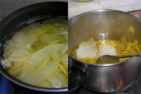 第五步:把沥干后的柚子丝倒入锅中,参入适量的盐水,煮沸后,倒出用清水冲洗,继续放入漏盆中沥水。沥干后倒入锅中,参入适量清水,加入冰糖,煮沸腾后,倒入四分之一的果肉,煮沸腾后,关小火继续煮,直到把柚子丝煮到半透明的状态,就可以倒入全部的果肉继续煮,倒进去就要一直用锅铲翻炒,直到把果肉和果皮全部煮烂,全部融合在一起。