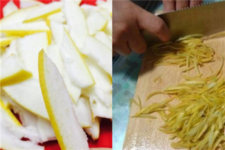 第三步:把剥下来的柚子皮进行处理,把柚子皮上附着的白色瓜瓤用刀仔仔细细的给刮下来,只留下柚子皮最外面薄薄的金黄色的那一层,这不仅可以让柚子茶的颜色更加好看而且味道还更加好。再用菜刀把留下的那层金黄色皮切成丝,尽量切得细碎一些,这样在后面做出来的柚子茶才会更加粘稠,冰糖才会更加的融合进柚子皮里面,才不会浪费材料。