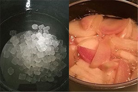 锅中烧适量水加入冰糖,搅拌至完全融化后,倒入切好的桃肉,搅匀泡十分钟后开大火煮开,注意糖水不要放太多,因为熬煮的过程中桃子本身也会出汁水的,烧开后转中火收汁。