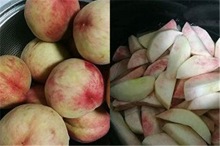 这次做的是桃子果脯,首先把买来的新鲜桃子用盐搓掉表面的绒毛, 然后用刀削去皮,切成条状去掉果核装进碗中,切的大小按照自己喜好即可,没有特别的规定。