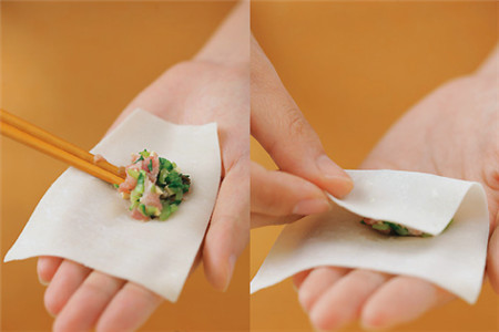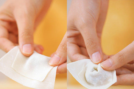 然后用左手捏住混沌皮的一角,右手也要捏住,之后双手将混沌皮形成一个金元宝的形状,至于怎样才能形成这样的形状还是需要自己琢磨的,这样混沌便包好了,你们学会了吗?