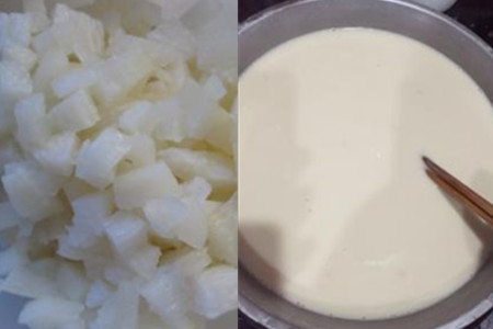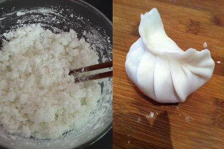 第三步,煮开水,然后将澄粉和淀粉加在一起,混合均匀后,用煮好的开水倒入粉中,一边搅拌一边加水,倒完水后将粉揉在一起使其变成面团。