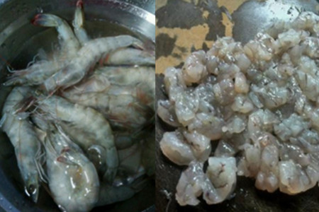 第一步,把买回来的鲜虾去壳之后,把虾切成肉丁,把胡萝卜洗干净后也切成丁。