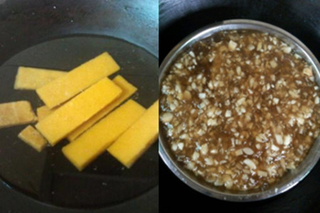 第四步,把黄糖放入锅中,在锅里面加入300克的水,将黄糖煮成黄糖水。