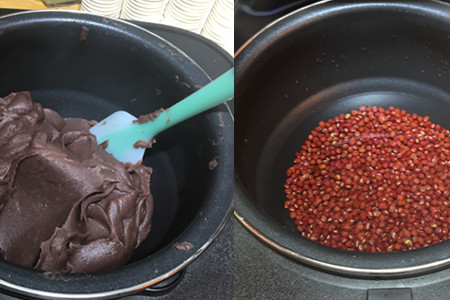 等到整个锅都流满油之后再倒入红豆翻炒。切记炒红豆泥的时候要用小火翻炒,为了避免红豆炒焦,然后再慢慢地倒入适量的糖。千万不要一次把糖全部倒进去。慢慢加糖,可以调整口感。把红豆馅儿炒到结团就算完成了,等到它放凉之后就可以冷藏起来,如果是一两天之内可以用完的话就放到冷藏,长时间不用的话就放到速冻,等到需要的时候再拿出来回温。