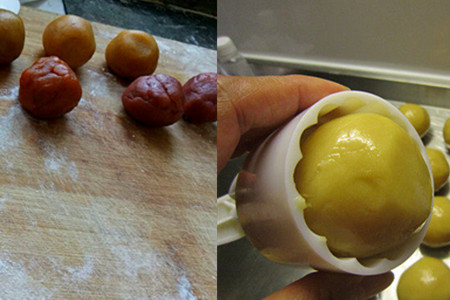 把饼皮包好红豆馅之后,放进月饼模具里,一压,二敲,三拍,扁平的月饼就制作好了。
