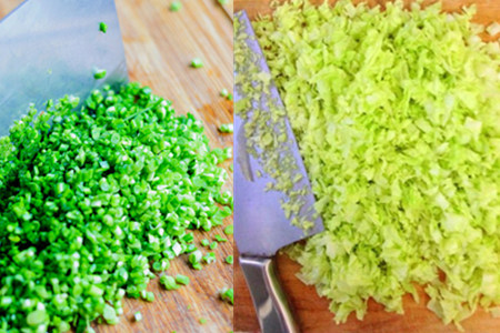 我们先把蔬菜切成小段,然后将肉和蔬菜一起放在切菜板上用菜刀仔细的剁碎,在这个过程中我们用手将肉和蔬菜混合然后再剁碎,这样能够让肉汁和蔬菜汁混合在一起,吃起来不会腻而且口感会更好。
