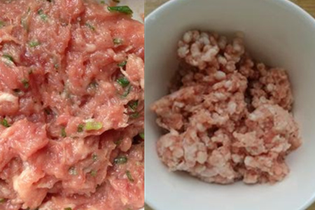 我们将肉腌制一会儿后,就可以剁肉了,很多人会选择在买肉的时候就让卖家将肉用磨肉机磨好,但是那个肉粒还是有些大。在这里还是推荐大家将肉买回家并腌制后自己剁碎,在这里可以先不要剁的特别的碎,之后我们还可以和蔬菜一起剁。