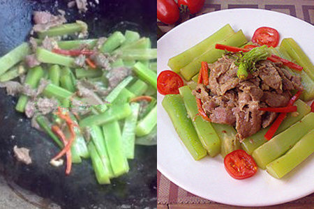 第五步:放入芹菜段,翻炒至变色,再放入驴肉,少许的清水,盖锅等待八分钟,即可食用。【伊秀原创未经允许,谢绝转载!】