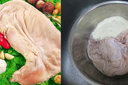首先,仔细清洗猪肚。洗猪肚一向是个麻烦事,因为猪肚内的粘液很难彻底清除。大家在清洗时,可以先倒一碗面粉,对猪肚进行反复搓揉,然后用水冲洗,就可以有效去除肚内的粘液。然后再用几根香葱和姜片放置进肚内,搓揉两分钟后冲洗干净,这样可以有效去除猪肚的异味,让猪肚吃起来更香。