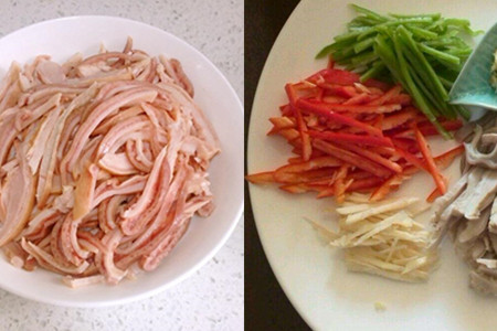 第二步,将猪肚切丝,腌制入味。猪肚切丝的时候一定要尽量薄而细,这样炒起来可以快速熟透。而为了避免我们在爆炒时时间过短,猪肚不能彻底入味,所以我们要在炒之前,先将猪肚腌制入味。