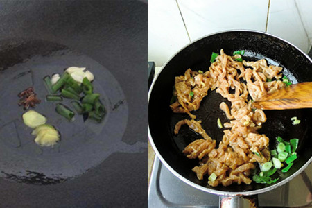 第四步,开始炒菜。爆炒要求下锅和出锅都要迅速,所以我们在做这道菜的时候油可以稍微多倒一点,下菜时的油温也一定要足够高才行。等油锅烧到足够热的时候,先将葱段、辣椒、姜丝下锅炒制入味,然后下青椒和红椒,炒制变色后再倒入猪肚丝,猪肚丝下锅后一定要快速翻炒,待猪肚变色之后就需要立刻起锅,盛入盘中。
