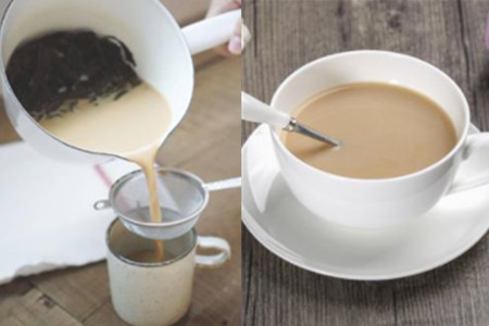 第五步,将煮好的茶和煮好的奶分别用两只手拿,然后快速地将两者撞入到一个容器里,再加入适当的砂糖,用勺子搅拌均匀,倒在杯子上就可以饮用了。