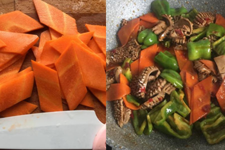3.用刀削掉胡萝卜的外皮,切成菱形片,青椒切大块待用。起一口炒锅,锅内放适量油,开火烧热,将姜丝下油锅爆香,再将胡萝卜片下锅煸炒。胡萝卜片炒软之后,将焯过水的猪腰下锅快炒。接着淋入适量生抽和料酒,加入两勺豆瓣酱,翻炒均匀。