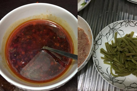 2.用微波炉高火加热调味汁1分钟,分为两次加热,每次加热30秒,两次中间间隔1分钟。贡菜洗净切段,挤干水分,待用。