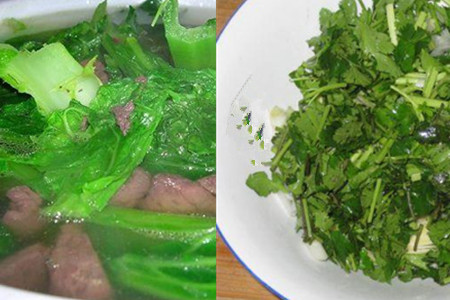 这道汤的配菜是豆腐和青菜(有的地方也叫小白菜),豆腐要选专门用于煮汤的老豆腐,才不容易煮烂。做的时候将豆腐切成和猪血差不多大小的块状,青菜摘成一片一片的并洗净。青菜叶的底部里容易藏泥沙,所以清洗的时候一定要注意掰开仔细冲洗,以免吃起来会磨牙。