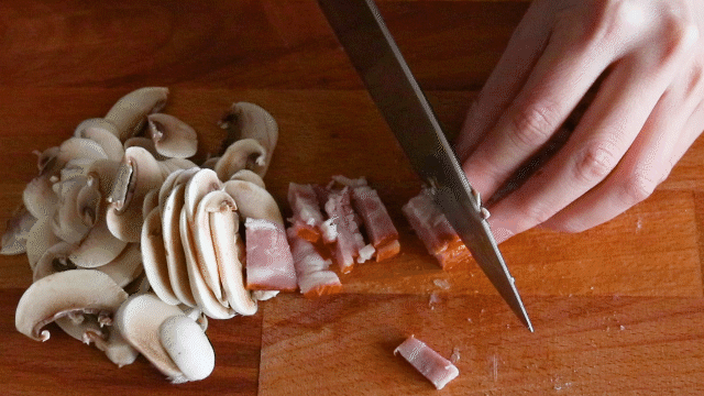 1 口蘑切片,培根切小块。
