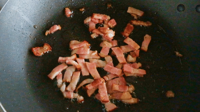 2 锅中放入一小块黄油,黄油融化后放入培根翻炒,炒出油后即可盛起备用。如果喜欢香脆的口感,可以炒久一点,直到培根变硬。