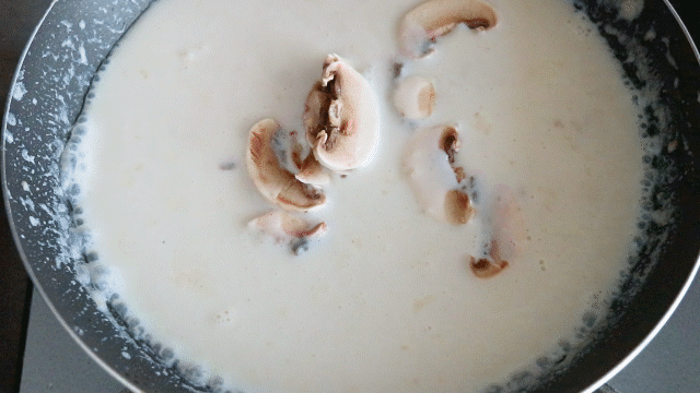 ▲ 加牛奶的时候一定要关上火,牛奶最好是从冰箱冷藏拿出来的冷牛奶。如果忘记关火,做出来就变成疙瘩汤了……