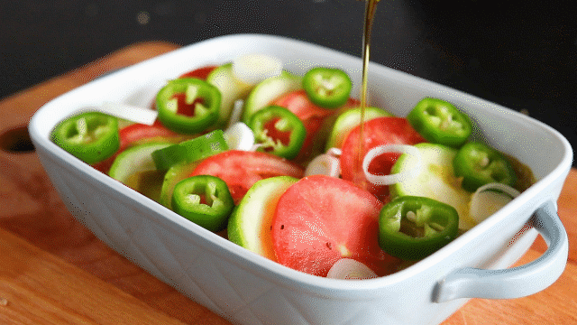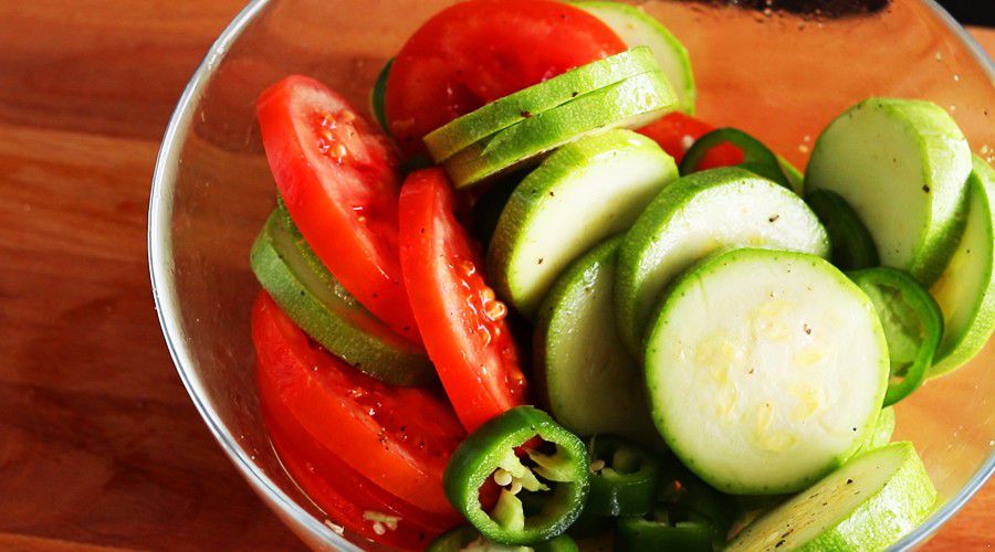 3 西葫芦切片,青椒切圈,大葱切圈。把西葫芦、番茄、青椒、大葱放入玻璃碗,加入少许橄榄油、黑胡椒碎和盐,搅拌均匀。
