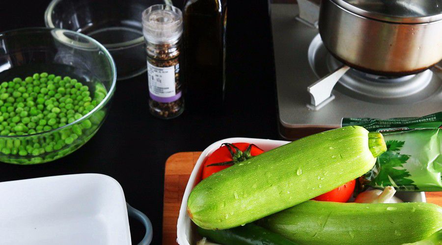 豌豆(超市急冻豌豆半袋的分量)|西葫芦1个|番茄2个|青椒1个|大葱一小段|大蒜三瓣|橄榄油|黑胡椒|干欧芹