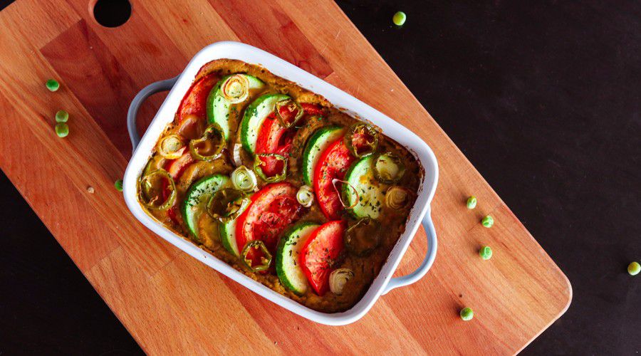 5 把豆泥铺到烤碗底部,豆泥上铺上蔬菜片,再淋少许橄榄油在表面,撒上干欧芹。烤箱预热200摄氏度,烤20分钟,调低至180摄氏度,再烤20分钟即可。