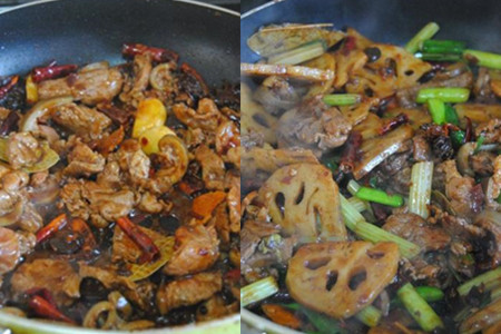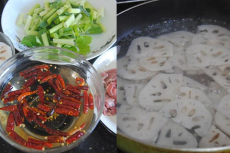 1.羊肉洗净切片,莲藕去皮切片,芹菜洗净切寸段,干辣椒剪成小段用清水浸泡。烧一小锅开水,将莲藕片放入焯一下,捞起沥干。