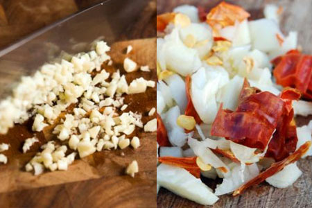 第二步,剁碎辣椒和大蒜,想省事也能放入搅拌机。制作期间必须避免与水分接触。