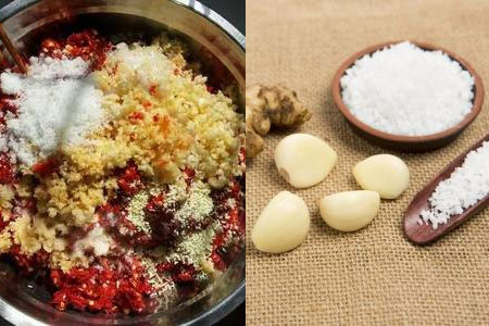 辣椒末准备好以后,就是加入配料的时候了,辣椒酱好吃,不仅仅是因为辣椒,制作过程中加入的配料也会影响到辣椒酱的口味,最基本的可以加入大蒜仁、食盐、三花酒,根据个人的口味,还可以加入梨、苹果、姜、西红柿等,会使辣椒酱变得酸甜一些,需要将辣椒末与备好的配料搅拌均匀。