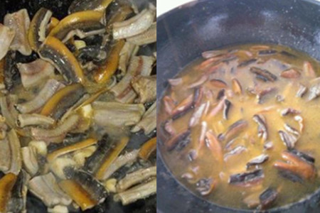 第三步,在锅中热油,然后把姜片放进去炸,把姜片炸成金黄色之后,就把黄鳝倒进去,倒的时候注意沿着锅边慢慢倒,因为黄鳝有水,而锅有油。