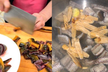 第一步,把生的黄鳝用刀杀了,砍去黄鳝的头,剖开它的腹部,把里面的内脏去掉,用自来水冲洗干净体内的血水,然后用刀剁成一段段。
