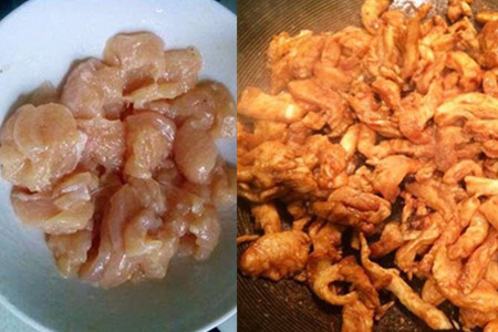 1.将鸡胸肉切长成片,用料酒、生抽腌20分钟。