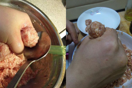 准备一锅开水,并持续加热,这个时候就可以开始挤肉丸了。为了防止牛肉沾手,首先手应该用水打湿,然后用手的虎口的位置挤出肉丸,再用汤勺挂出肉丸,放在加热的热水里,注意每做好一个肉丸就要把汤勺清洗一遍,避免牛肉粘在汤勺上,破坏肉丸的形状。