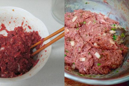 把搅拌后的肉酱盛装在一个盆子里,加入事先准备好的玉米粉和香料,用擀面杖或者饭勺进行搅拌,搅拌的过程注意要用力的进行,直到肉酱变成胶状,有粘性。当然这里的操作也可以在搅拌机里进行,经过搅拌后的牛肉会非常柔亮。搅拌后就进行冷藏,通常制备牛丸的牛肉肉酱都会冷藏一个晚上后再继续制作牛丸,经过一个晚上冷藏的牛肉肉质会更加的q弹。