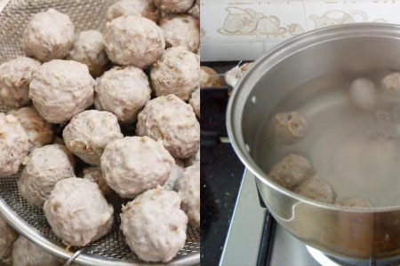 准备一个装满冰水的大锅,当肉丸焖熟之后,迅速捞起并放入冰水里面,以防牛肉丸进入空气表面变得干黑。冻存之后就可以随时享受美味的肉丸啦