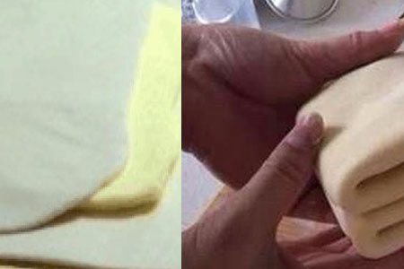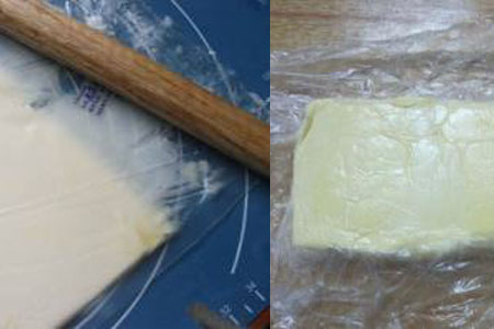 用擀面杖把面团再一次擀成长方形的形状,两端向中央部分翻折,再以中间为界对着,用保鲜膜封好后冷藏20分钟左右。冷藏后继续重复擀面的操作,重复至少三次。最终将面团擀成薄片。这样千层酥皮就算是完成了,擀面需要花费较长的时间,但是慢工出细活,在这一步的工作也是十分重要的。