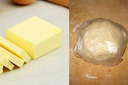 称取月300g的玛琪琳,用刀具切成小块后,加入面粉中继续和面的操作,和面的过程需要继续加入微量的水,直到把面和成表面光滑的样子就可以,接着放入保鲜膜中,让面团醒面接近20分钟左右。