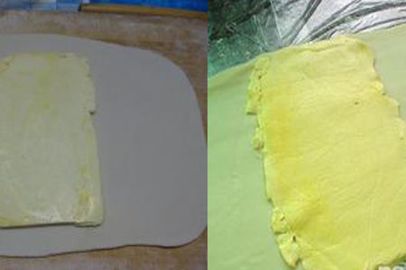 拿经过醒面后的面团放在已经撒过面粉的案板上,用擀面杖擀成长方形的形状,随后把冷藏的玛琪琳薄片放置在长方形面皮的中央位置,把面皮的一边翻折到玛琪琳上,盖住玛琪琳的表面,同时将另一端也翻转过来,收口向下。