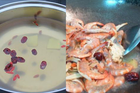 食材:鲜虾一斤、红枣8颗、枸杞适量、料酒适量、鲣鱼粉适量、当归适量、油适量、盐适量