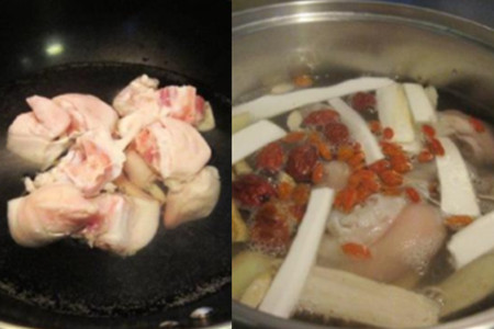 第三步,一边煮药材,一边另起炉灶,用芝麻油热锅,把切好的老姜片放进去爆炒,接着把鸡肉也放进去,将鸡肉炒至黄色,再把红枣和枸杞一同放进去翻炒。
